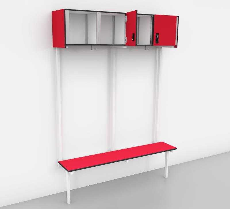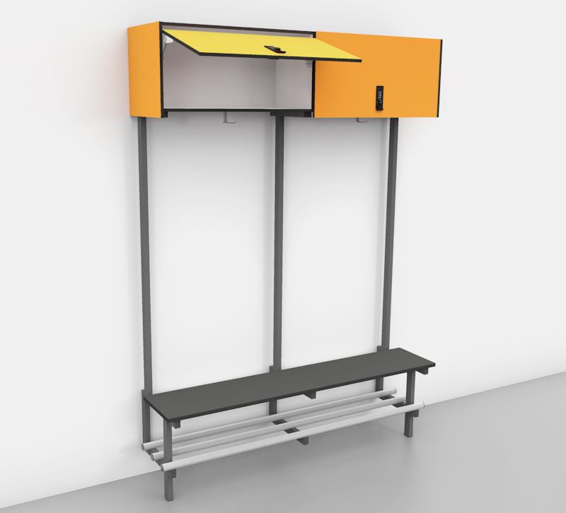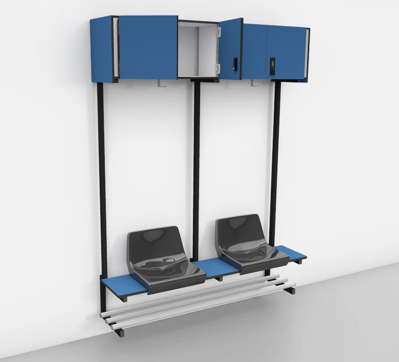 De opbergkasten zijn verkrijgbaar per zitplaats in verschillende indelingen : 2 open vakken, combinatie open vak en kast met draaideur, 2 kasten met draaideuren of 1 opbergkast met klepdeur. Door de voorliggende deuren worden de opbergkasten op een natuurlijke manier geventileerd. Voor de sluiting van de kastdeuren kan gekozen worden uit een standaard cilinderslot of een mechanisch codeslot voor vaste of wisselende gebruikers. Ideaal voor het veilig opbergen van persoonlijk materiaal. Per zitplaats is er onder de opbergkast een dubbele aluminium kleerhaak voorzien.