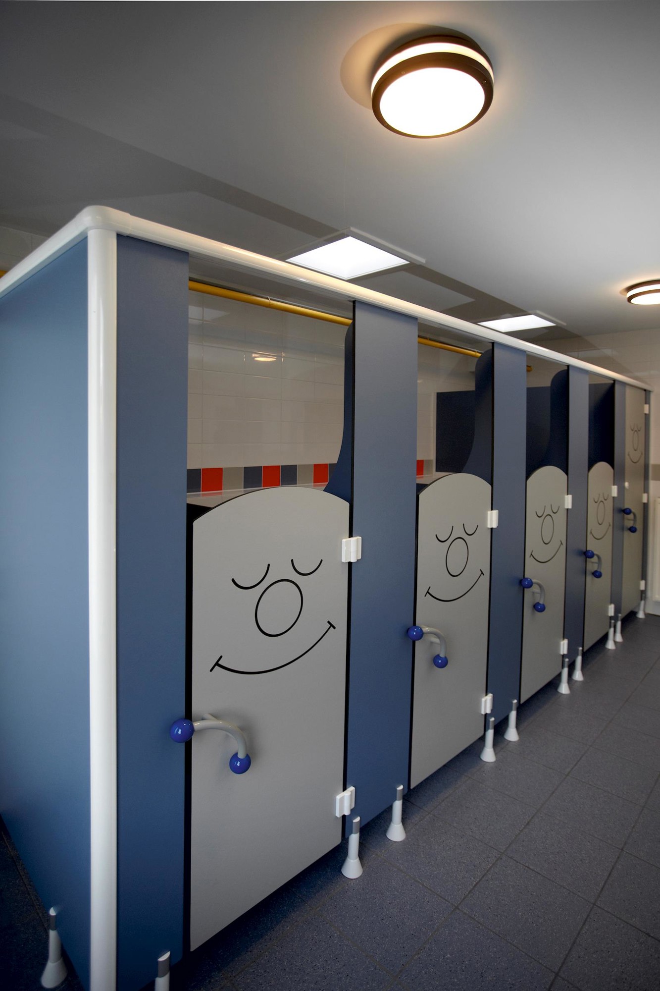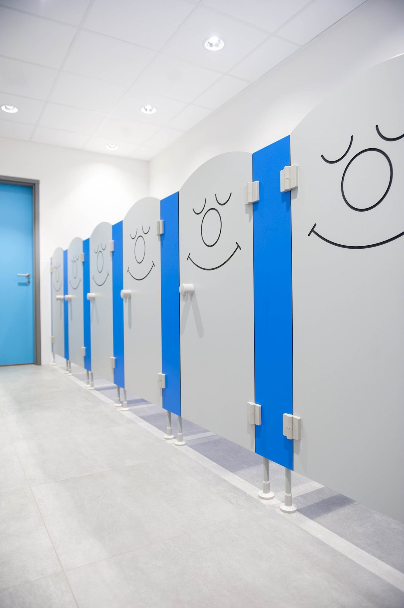 Ook aan onze allerkleinsten werd gedacht. Afkor biedt u een cabine aan, speciaal geconcipieerd voor de kinderen. Veiligheid staat hier bovenaan. De deuren liggen in hetzelfde vlak als de voorwand. Een rond aluminium deurscharnier loopt over de volle hoogte van de deur en is voorzien van een geïntegreerd dichtlopend en geruisloos sluitsysteem. Het zelfsluitend vingerveilige deurscharnier bevat een ingewerkt dempingsmechanisme waardoor de deur in de laatste sluitingsfase afremt en zacht dichtgaat. Een slot is niet nodig, zodat geen paniek ontstaat wanneer de deur niet open wil. Door de aangepaste hoogte van de deuren en de tussenwanden is permanent toezicht door de opvoeders mogelijk. Toch hebben de kinderen er hun privacy. De cabines kunnen perfect gecombineerd worden met 'grote' cabines voor meester en juf. Meerdere varianten van deurvormen zijn mogelijk. (recht, gebogen of wolk)
