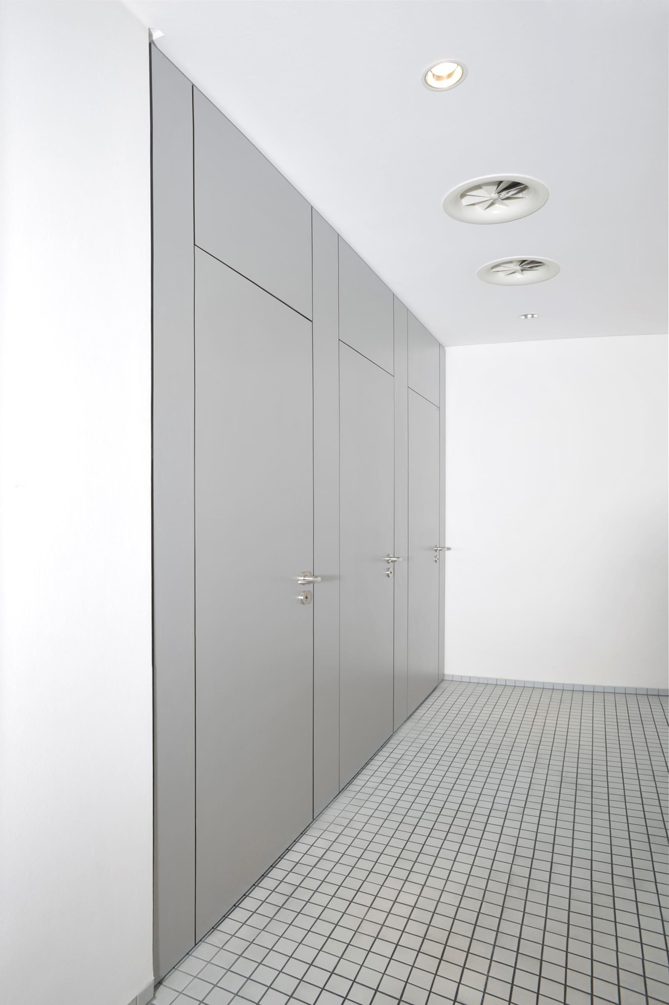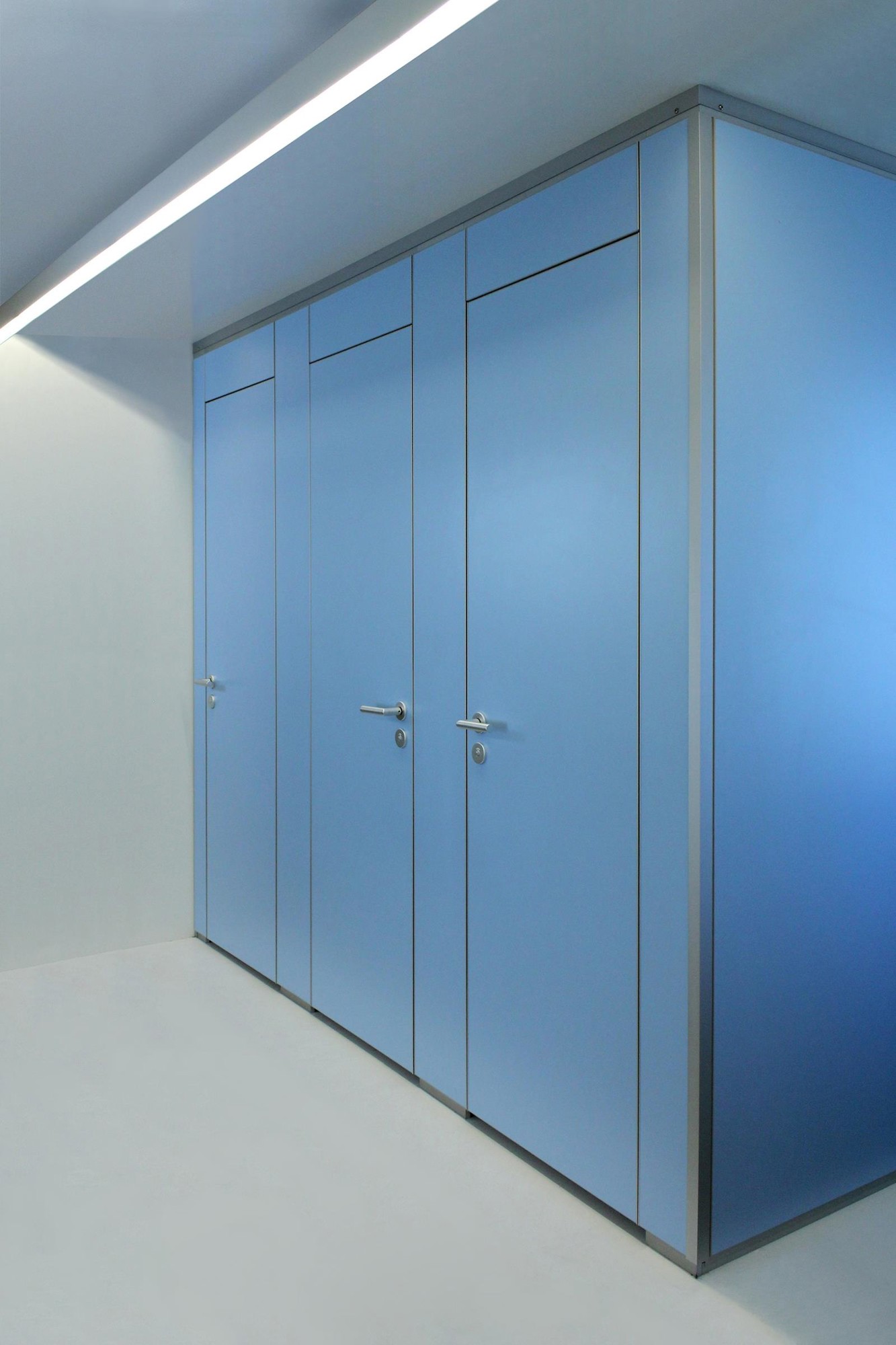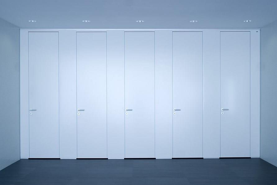 De deuraanslag wordt gemaakt d.m.v. sponningen met geluid-demping. De deuren worden voorzien van vrij-en bezetsloten met geanodiseerde deurkrukken en rozetten, alsmede aluminium zelfsluitende scharnieren. Variante in RVS.