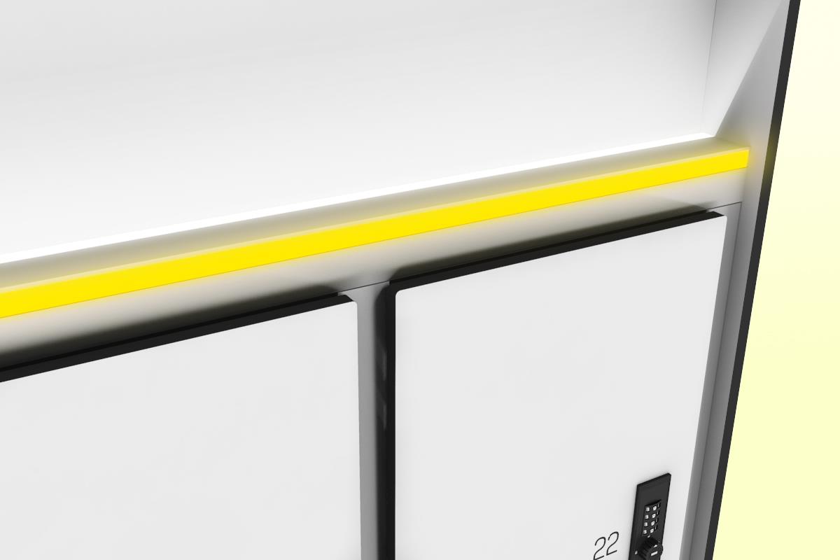 In het speciaal ontworpen aluminium bovenprofiel is de mogelijkheid voorzien voor ledverlichting in 2 posities. Aan de voorzijde kan men een sfeerverlichting integreren en in de bovenkant van het profiel een lokaalverlichting.  Beide verlichtingen kunnen afzonderlijk worden ingesteld/bediend (schakelaar, afstandsbediening, smartphone).  Mogelijkheid tot afzonderlijke aansluiting op een timerfunctie. Optioneel : bovenpaneel in HPL met of zonder fotoprint.